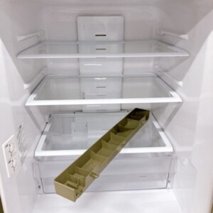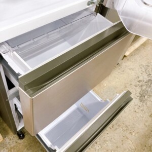 扉面はヘアライン調で、正面パネルに微細な擦れがわずかに見られる程度。庫内は棚板・ケース・製氷トレイなど主要付属が揃い、清潔感のある状態でした。動作確認では冷却・照明ともに良好、異音や臭気はなし。銘板より幅540×奥行655×高さ1520mm/冷蔵199L・冷凍66L/年間消費電力量323kWhで、省スペース&省エネの265L・3ドアクラスとして都市部需要にマッチする仕様です。