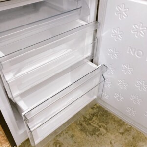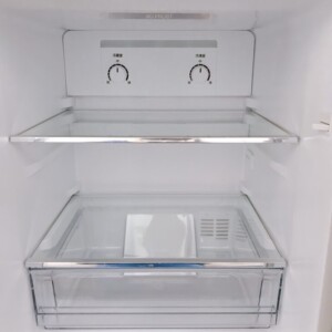 外装はシルバー系パネルで、正面に薄い拭きキズ・くすみがわずかに見られる程度。目立つ凹みや大きな塗装剥がれはありません。庫内は強化ガラス棚に割れ欠けなし、チルドケース・野菜ケース・ドアポケットともに揃い、パッキンの密着も良好でした。冷凍室は3段トレーがそろい、霜の付着も軽微。動作確認では冷蔵・冷凍の温度ダイヤル反応、庫内灯、ファンの動きに問題はなく、再販前クリーニングの工数は小さく抑えられる状態でした。
