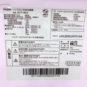 今回は静岡県御前崎市にお住まいの30代のご夫婦より、Haier(ハイアール)のノンフロン冷凍冷蔵庫 JR-F18KS(2024年製)を出張買取にてご依頼いただきました。