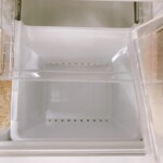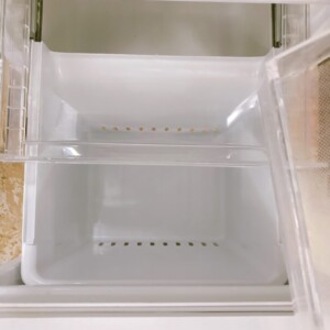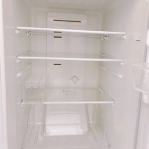 外装はホワイトパネルで、正面にごく軽い擦れ・小さな拭きキズが見られる程度。目立つ凹みはありません。庫内はガラス棚・野菜ケース・ドアポケット・製氷トレイまで揃い、割れや欠けなし・におい移り少の良好コンディションでした。温度調整ダイヤルの反応、庫内灯点灯、パッキン密着を確認し、冷蔵・冷凍ともに動作良好と判定しています。