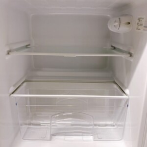外装はホワイトで、前面に薄い擦れ跡が数か所ある程度。目立つへこみや割れはありません。庫内は強化ガラス棚・クリアな野菜ケース・ドアポケット・温度調整ツマミが揃い、割れや欠けなし。上段の冷凍室は製氷トレー付きで、内壁の傷や大きな霜付きも見られませんでした。通電確認では冷蔵・冷凍の温度反応、庫内灯の点灯、ドアパッキンの密着いずれも良好。再販前クリーニングの工数が少なく済む個体と判断しました。