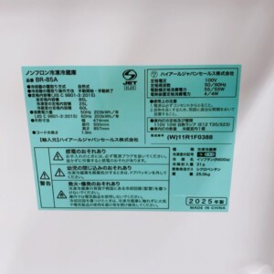 今回は福島県福島市にお住まいの40代・女性より、出張買取のご依頼をいただきました。お預かりしたのはHaier(ハイアール)ノンフロン冷凍冷蔵庫 BR-85Aで、2025年製/定格内容積85L(冷蔵60L・冷凍25L)。本体サイズは幅474×奥行500×高さ857mm、年間消費電力量203kWhのコンパクト2ドアモデルです。ご連絡はLINEにて事前査定をご利用。お客様の属性は主婦・親子世帯・賃貸(マンション)で、型番・銘板・設置状況の写真をあらかじめ送っていただきました。