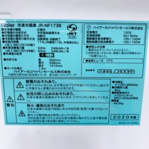 今回は神奈川県小田原市にお住まいの30代女性のお客様よりHaier(ハイアール)冷凍冷蔵庫 JR-NF173B(2020年製)を出張買取にてご依頼いただきました。