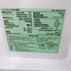 今回は熊本県玉名市にお住まいの30代男性のお客様よりアイリスオーヤマ製 ノンフロン冷凍冷蔵庫 PRC-B092D-W(2024年製)の出張買取をご依頼いただきました。