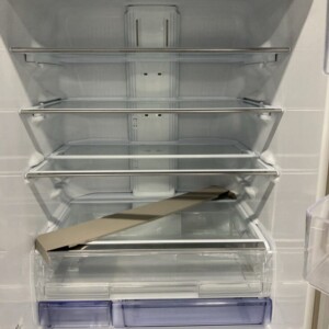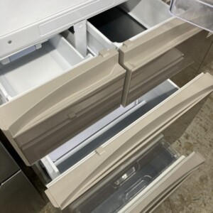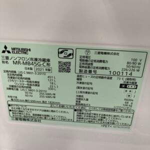扉の開閉・温度切替・庫内灯などの基本動作は良好。冷蔵室は強化ガラス棚が3枚+下段ガラスカバー、ドアポケットやクリアケース類も欠品なしで揃っていました。野菜室・冷凍室の引き出しも割れや欠けは見られず、庫内は全体的に清潔です。外装は正面右寄りにうっすらとした擦れが数か所ある程度で、目立つ凹みはありません。エネルギー表示ラベルからR600a冷媒・日本製・定格451Lを確認できたほか、年式は2021年製でした。