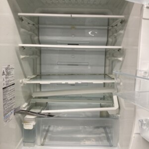 到着後に通電し、冷蔵・冷凍の基本冷却は問題なし。銘板からR600a冷媒、消費電力量320kWh/年、サイズ 幅600×奥行703×高さ1816mmを確認しました。庫内はガラス棚が3枚、下段ケース、ドアポケット類は概ね揃っていますが、写真のとおりチルド室のフタ枠の割れ・棚受けの歪みがあり、上段棚のフチに劣化による汚れが見られました。外装は前面と引き出し面に細かな擦れ・小傷、使用年数相応のくすみが点在。自動製氷用の貯水タンクは残っており、割れはありません。総じて動作良好だが一部パーツ破損と使用感の強い個体という評価です。