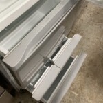 到着後に通電し、冷蔵・冷凍の基本冷却は問題なし。銘板からR600a冷媒、消費電力量320kWh/年、サイズ 幅600×奥行703×高さ1816mmを確認しました。庫内はガラス棚が3枚、下段ケース、ドアポケット類は概ね揃っていますが、写真のとおりチルド室のフタ枠の割れ・棚受けの歪みがあり、上段棚のフチに劣化による汚れが見られました。外装は前面と引き出し面に細かな擦れ・小傷、使用年数相応のくすみが点在。自動製氷用の貯水タンクは残っており、割れはありません。総じて動作良好だが一部パーツ破損と使用感の強い個体という評価です。