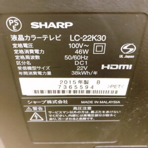 千葉県千葉市でシャープ液晶テレビ LC-22K30(2015年製)を出張買取|テレビ無料引取りしました