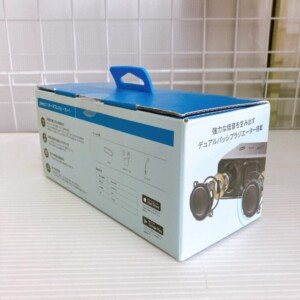 撮影いただいた写真および現地確認の結果、パッケージは未開封に近い保管品。外装の角に保管由来の軽いつぶれ・擦れが見られるものの、封緘テープは残っており内容物に開封痕はありません。箱面の表記から、16W(8W×2)ドライバー/BassUp対応/IPX7防水/最大20時間再生/Bluetooth 5/アプリEQカスタマイズ、デュアルパッシブラジエーター搭載などの仕様を確認。付属はUSB-Cケーブル・ストラップ記載で、再販時に求められる同梱条件を満たしています。