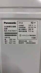 千葉県千葉市でパナソニック NA-FA70H7を出張買取 使用感少なめ・動作良好で適正査定しました