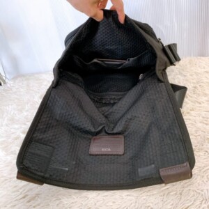 お預かりしたのは、TUMIの中でも人気の高いAlpha Bravoシリーズ メッセンジャーバッグ(バリスティックナイロン×レザーコンビ)。全体的にきれいな状態で、角スレや目立つ傷は見られません。金具やファスナーの動作も良好で、内部のナイロンライニングにも大きな汚れや破れはなく、保存状態は非常に良好でした。ショルダーストラップも使用感が少なく、型崩れも軽度です。