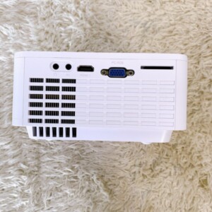 お預かりしたT6は、外装に日常使用による細かな擦れが少し見られる程度で、割れや大きな凹みはありません。レンズ面は傷・くもりなし、フォーカスと台形補正リングの動きも良好でした。接続端子はHDMI×2、USB、VGA、AV、イヤホン端子、SDカードスロットを搭載。実機テストではHDMI入力での映像出力・内蔵スピーカーからの音声出力を確認でき、付属の電源ケーブル・HDMIケーブル・AVアダプタ・リモコンもそろっていました。ファンノイズは通常レベルで、長時間再生でも発熱は許容範囲内でした。