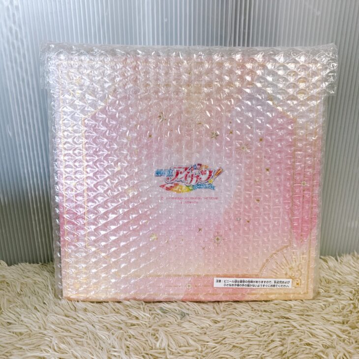 お預かりしたお品は、輸送箱未開封(開封シール完備)・気泡緩衝材付き・保管状態良好という非常に良いコンディションでした。外箱には輸送時に付いたごく軽微なスレが見られる程度で、本体パッケージには破損や潰れ跡もなく新品同等品としての評価となりました。箱側面の印字「劇場版アイカツ!10th Anniversary プレミアムレアカードセット」および出荷ラベルから、バンダイナムコ公式通販限定生産品であることを確認済みです。