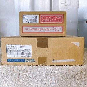 今回は熊本県宇城市にお住まいの50代夫婦世帯のお客様より、TOTO ウォシュレット アプリコット F1A(型番:TCF4714 )と便器洗浄ユニット TCA527の新品未開封品を出張買取にてお申し込みいただきました。