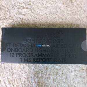 外箱には多少の保管スレが見られるものの、シュリンク未開封の新品状態でした。箱のシールもしっかりと封印されたままで、内部未確認。G PROシリーズ特有のRGBライトシンク搭載・テンキーレスデザインが特徴で、箱の側面に型番「G-PKB-002LN(GX RED LINEAR)」が確認できました。