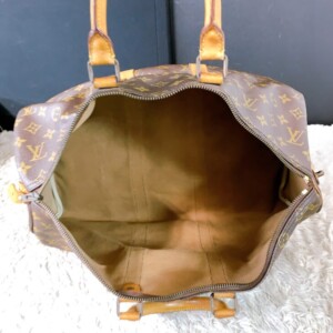 外観はモノグラム・キャンバスに大きな破れはなく、全体のハリも十分に残っています。一方でヌメ革部分(ハンドル・根革・パイピング)にはヤケ・色ムラ・黒ずみが見られ、角部に擦りスレが点在。金具にはくすみ、ファスナーテープに軽度のヨレを確認しました。内装は写真のとおり大きなシミや破れはなく概ね良好です。付属品は南京錠・鍵・ポワニエ・ネームタグは欠品、ショルダーストラップ付きのバンドリエール仕様ではありません。ファスナーの可動は良好で、実用面に大きな支障はありませんでした。