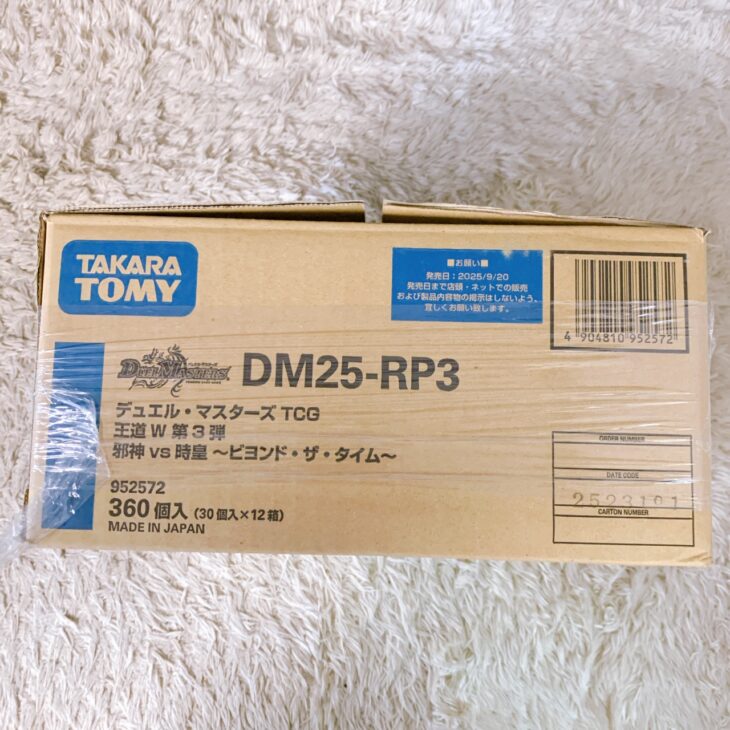 今回は大阪狭山市にお住まいの30代・男性より、デュエル・マスターズTCGの最新弾、DM25-RP3「邪神vs時皇~ビヨンド・ザ・タイム~」未開封BOX×2を出張買取でお預かりしました。ご依頼者さまは会社員/親子世帯/賃貸(マンション)。電話からご依頼をいただき、当日中に日程を調整してお伺いしました。