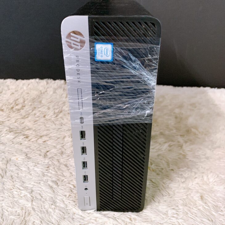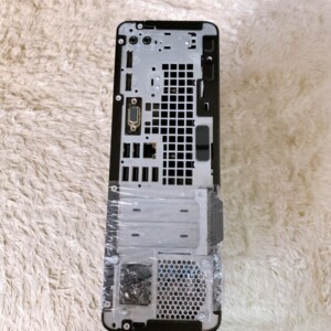 本体は前面にHP ProDeskロゴ・スリム光学ドライブベイ、背面はDisplayPort×2/VGA×1/USB多数を備えた標準構成。外装は使用に伴う細かな擦れと小傷が見られるものの、割れや大きな凹みはなく全体の印象は良好でした。電源投入・画面出力・USBポートの反応は良好で、筐体内の異音や異常発熱はなし。付属品は電源コード類が揃っていました。