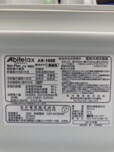 AR-100EはAbitelaxブランドの中でも人気の96Lクラス・省エネ設計のスタンダードモデルで、冷凍性能(フォースター)を備えている点も評価ポイントです。2019年製で年式はやや経過していますが、庫内の清潔さ・動作安定性・デザイン状態の良さが評価され、1,500円での査定価格をご提示しました。