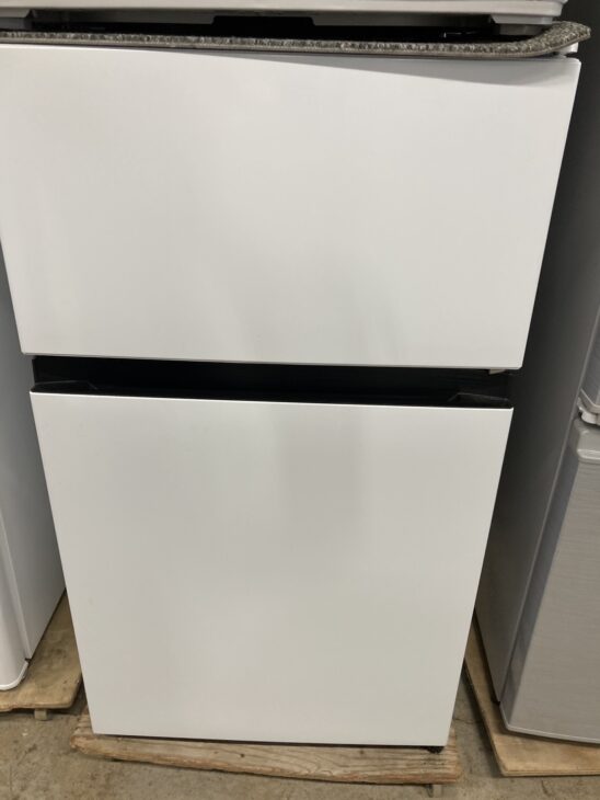 外装はホワイトボディで、正面下部と側面に生活使用による小さな擦れ・薄い点キズが数か所見られる程度。庫内はガラス棚・野菜ケース・ドアポケットが揃っており、ニオイ残りや黄ばみは軽微でした。動作確認では冷蔵・冷凍ともに設定どおりに冷却し、異音や振動は認められません。銘板よりR600a冷媒/封入量43g、年間消費電力量319kWh(50/60Hz共通)、サイズ:幅550×奥行610×高さ1556mmを確認。実用性の高い冷蔵174L・冷凍53Lの2ドアで、ワンルームから2人暮らしまで使いやすい容量帯です。