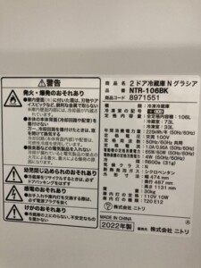 今回は茨城県水戸市にお住まいの30代男性より、ニトリ 2ドア冷蔵庫 Nグラシア NTR-106BK(2022年製)を出張買取にてご依頼いただきました。