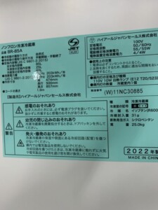 山梨県甲府市でHaier(ハイアール)85L 2ドア冷蔵庫 BR-85A(2022年製)を出張買取|外装に細かな擦れあり・庫内きれいで高評価査定