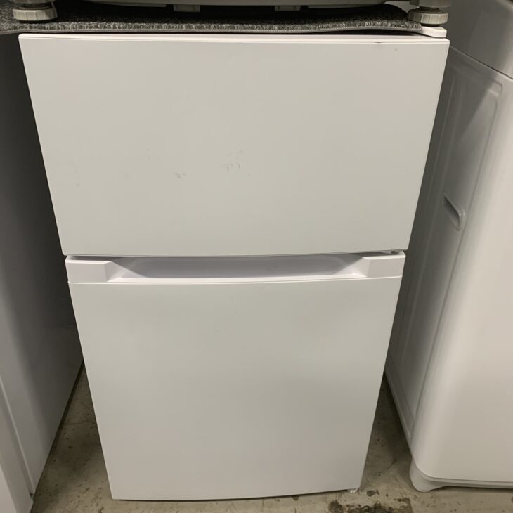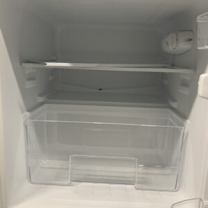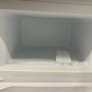 本体は清潔感のあるホワイトカラーで、正面パネルにごくわずかな小キズが確認されましたが、全体的に非常にきれいな印象です。庫内は未使用に近く、棚・トレー・製氷皿も傷や汚れなし。動作確認では冷却・冷凍機能ともに正常で、異音や温度ムラもありませんでした。銘板より定格内容積は87L(冷蔵61L/冷凍26L)で、幅475×奥行502×高さ858mmのスリムボディ。重量は約24.5kgと軽量で、一人暮らし向けに人気の高い2ドアモデルです。