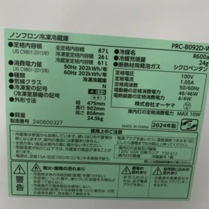 愛知県豊明市でアイリスオーヤマ PRC-B092D-W(2024年製)87L冷蔵庫を出張買取|ほぼ未使用・外装小キズありで高価査定
