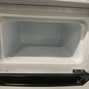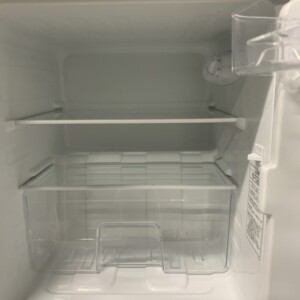 前面はホワイトパネルで、近接すると薄い擦れが数か所ありますが、大きな打痕やへこみはありません。庫内はガラス棚・野菜ケース・ドアポケットともに割れや黄ばみなしで清潔感があり、冷凍室も臭い移りのない良好な状態でした。動作確認では冷蔵・冷凍ともに温度調整ノブの反応良好、異音や温度ムラも見られません。銘板情報より定格内容積93L(冷蔵67L/冷凍26L)、外形寸法:幅481×奥行552×高さ860mm、質量28kg、年間消費電力量208kWh/年の2ドアモデルです。