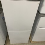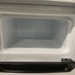 前面はホワイトパネルで、近接すると薄い擦れが数か所ありますが、大きな打痕やへこみはありません。庫内はガラス棚・野菜ケース・ドアポケットともに割れや黄ばみなしで清潔感があり、冷凍室も臭い移りのない良好な状態でした。動作確認では冷蔵・冷凍ともに温度調整ノブの反応良好、異音や温度ムラも見られません。銘板情報より定格内容積93L(冷蔵67L/冷凍26L)、外形寸法:幅481×奥行552×高さ860mm、質量28kg、年間消費電力量208kWh/年の2ドアモデルです。