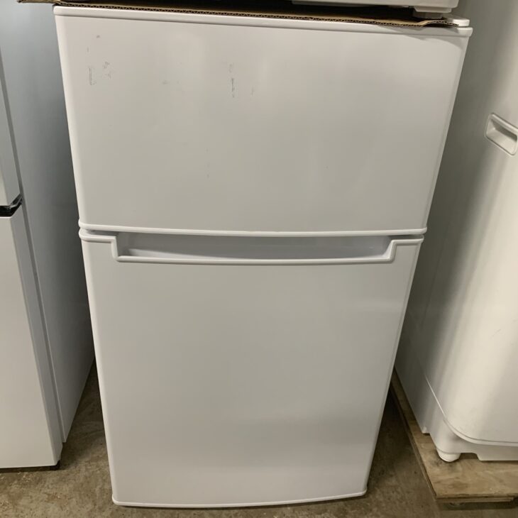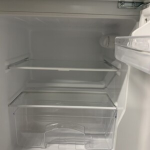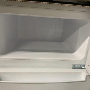 外装は上部に軽い擦れ跡が数か所見られるものの、全体的に清潔で良好な状態。庫内は冷蔵室・冷凍室ともに非常にきれいで、トレイ・ドアポケット・野菜ケースなどの透明パーツにも割れや変色はありません。動作確認では冷却性能・温度調整ダイヤル・庫内灯ともに問題なし。銘板より定格内容積85L(冷蔵60L/冷凍25L)、外形寸法幅474×奥行500×高さ857mm、重量25kg、年間消費電力量203kWhとなっています。