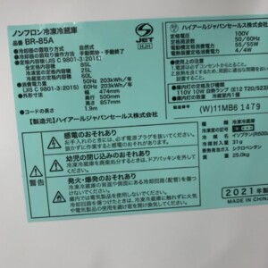 Haier BR-85Aは単身者向けコンパクト冷蔵庫として人気が高く、2021年製という点も評価ポイントとなりました。外装に軽微なスレがあったものの、庫内の美観・冷却性能・年式の新しさを総合的に判断し、当社では500円の査定価格をご提示しました。当社では出張費・搬出費すべて無料で対応しております。