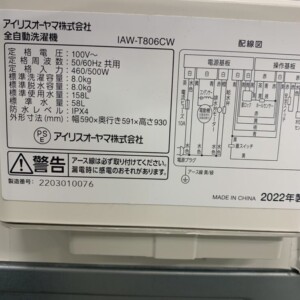 今回は群馬県渋川市にお住まいの30代男性・会社員の方より、アイリスオーヤマ IAW-T806CW(2022年製)を出張買取にてご依頼いただきました。