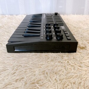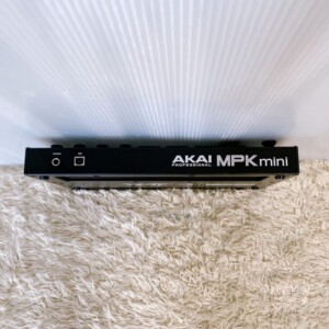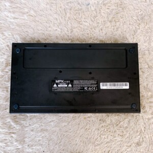 お預かりしたMPK mini mk3は、25鍵ミニ鍵盤/8つのベロシティ対応パッド/8ノブ/ジョイスティック/アルペジエータ/USBバスパワー/サステイン端子を備えた定番のMIDIキーボード。外観はトップ面と底面に使用に伴う細かな擦れが見られる一方、ツマミ・パッド・鍵盤とも反応は良好で、液晶表示も問題ありません。USB-Bケーブルが付属し、動作確認時にDAWとの認識もスムーズでした。箱・紙類は欠品ですが、実用面でのマイナスは少ない個体です。