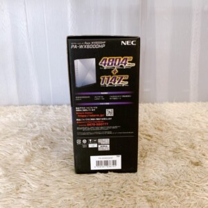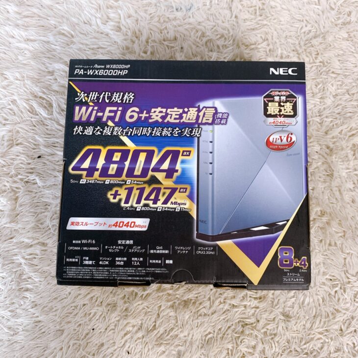 お預かりしたAterm WX6000HPは、開封済みながら本体・付属品未使用の非常にきれいな状態でした。Wi-Fi 6(IEEE802.11ax)対応で、最大通信速度は4,804Mbps(5GHz帯)+1,147Mbps(2.4GHz帯)。OFDMA/MU-MIMO/IPv6対応など、同時接続や高速通信を重視した上位モデルです。箱や説明書・ACアダプタ・LANケーブルなど、付属品もすべて揃っており、展示・使用履歴のない新品同等品として評価できる個体でした。