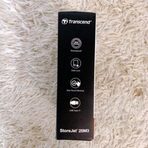 お送りいただいたStoreJet 25M3は、開封済みながら未使用に近い美品の状態でした。外装やパッケージにも傷や汚れがなく、付属のUSBケーブルも未開封のままでした。耐衝撃構造を持つこのシリーズは、持ち運び用ストレージとして人気が高く、データ保護性能にも優れています。