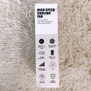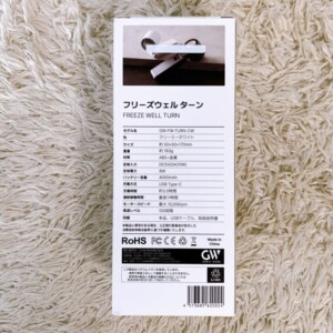 お預かりしたFREEZE WELL TURNは箱・取扱説明書・USB Type-Cケーブルが揃った良好なコンディション。開封済みですが、本体のスレや目立つ汚れはなく、ボタン表示・LEDインジケーターも問題なし。最大10,000rpm相当の高回転ファン/バッテリー容量4,000mAh/最大約11時間使用/100段階風量調整/360°角度調整/冷却プレート(体感-10℃)といったスペックを確認できました。ファン羽根や吸気部にホコリ付着は見られず、使用感はごく軽微です。