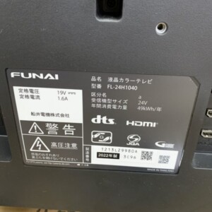 今回は岡山県新見市にお住まいの30代・女性より、FUNAIの24V型液晶テレビFL-24H1040(2022年製)の出張買取をご依頼いただきました。ご依頼者さまは会社員・単身・賃貸(アパート)にお住まいで、出張買取をご希望。モデル名は背面銘板とリモコン型番(FRM-104TV)から確認できました。