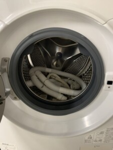 お預かりしたFLK842-Wは全体的にきれいな状態で、外装に目立つ傷や変色は見られませんでした。ドラム内も清潔に保たれており、ホースや輸送用の固定ボルトなどの付属品も揃っていました。動作確認でも洗濯・乾燥ともに正常に稼働し、特に不具合は見られませんでした。