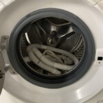 お預かりしたFLK842-Wは全体的にきれいな状態で、外装に目立つ傷や変色は見られませんでした。ドラム内も清潔に保たれており、ホースや輸送用の固定ボルトなどの付属品も揃っていました。動作確認でも洗濯・乾燥ともに正常に稼働し、特に不具合は見られませんでした。
