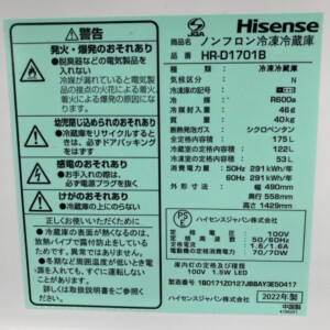 今回は新潟県三条市にお住まいの30代男性より、ハイセンス(Hisense)冷凍冷蔵庫 HR-D1701B(2022年製)を出張買取にてご依頼いただきました。