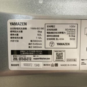 今回は群馬県藤岡市にお住まいの40代女性のお客様より、山善(YAMAZEN)全自動洗濯機 YWM-60(W)(2025年製)を出張買取にてご依頼いただきました。