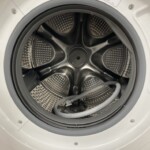 本体外装はホワイトカラーで、前面・側面とも目立つ打痕や黄ばみは確認されず、天面パネルの操作表示もクリアでした。ドア内側のパッキンは弾力が保たれ、庫内ドラムはスケールや黒ずみが少ない良好なコンディション。動作確認では洗濯・脱水・乾燥まで通しで異常は見られませんでした。給水・排水ホースが同梱、取扱説明書や元箱は無し。全体としては使用感少なめの美品と評価しています。