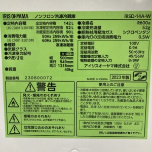 今回は群馬県藤岡市にお住まいの30代女性より、アイリスオーヤマ ノンフロン冷凍冷蔵庫 IRSD-14A-W(2023年製)を出張買取にてご依頼いただきました。