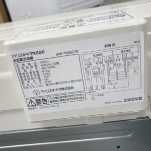 アイリスオーヤマの「IAW-T806CW」は、8kgの大容量とシンプル操作が魅力の人気モデル。2022年製と高年式、かつ庫内・外観ともに良好だったため、当社では13,000円で買取いたしました。