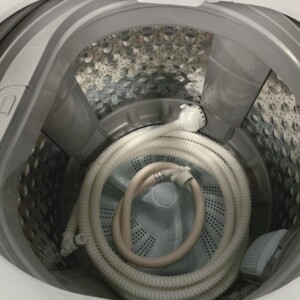 付属品として給水ホース・排水ホースがそろっており、槽内にきれいにまとめて保管されていた点も好印象です。動作確認では、洗い・すすぎ・脱水の各工程が問題なく行われ、異音や大きな振動もなく安定して稼働しました。このように、外観と機能の両面でコンディションが良かったことが査定額のアップにつながっています。