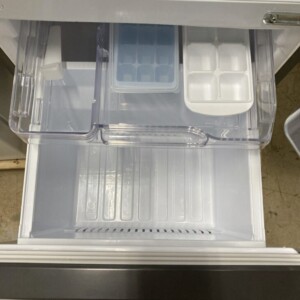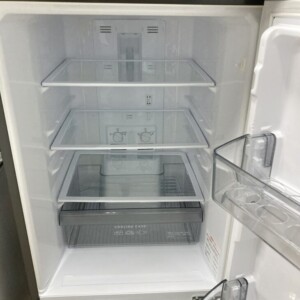 お預かりしたMR-P15H-Hは、外装の前面および側面にはっきりと分かる凹みが複数あり、全体的に使用感が強い状態でした。一方で庫内は比較的きれいに保たれており、棚・ドアポケットの割れなどは見られませんでした。動作は正常で、冷凍・冷蔵とも問題なく冷える状態であることを現場で確認いたしました。年式は2022年製と比較的新しめで、内部パーツにも欠品はありませんでした。