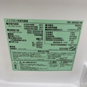 お預かりしたPRC-B092D-Wは、外観に目立つ傷やへこみのない良好な状態でした。庫内も非常にきれいで、ガラス棚・ドアポケット・野菜ケースなどの付属パーツはすべて揃っており、割れや欠けもありませんでした。冷蔵室・冷凍室ともに冷え方は正常で、温度調整つまみの動作や庫内灯にも問題はありませんでした。年式が2024年製と非常に新しい点も高評価ポイントです。