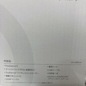 型番はCFI-2000A01で、現行型にあたるスリムモデル。内容物(本体、DualSenseコントローラー、HDMIケーブル、USBケーブル、電源コード、横置き用フット、印刷物、プリインストールゲームASTRO’S PLAYROOM)はすべて揃っていました。