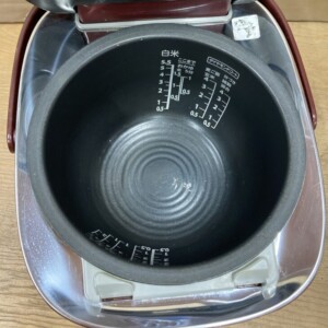 お預かりしたRC-10VSLは、本体外装に細かなスレや使用感が見られる状態でした。天面のパネルにも擦れ跡が確認できましたが、内部の内釜は目盛りがしっかり残っており、コーティングの剥がれは少なく、全体としては使用による経年劣化がある一般的な中古コンディションです。動作確認では加熱・圧力機能ともに問題なく、表示パネルやボタン操作も正常に反応していました。
